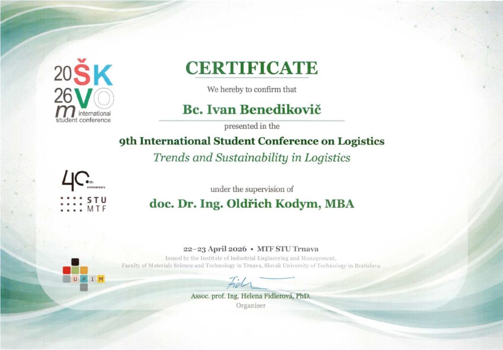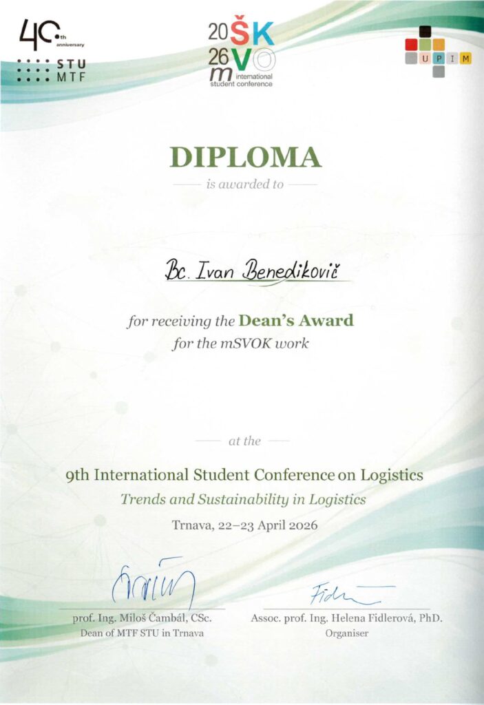 Jako každý rok i letos se studenti VŠLG zúčastnili mezinárodní studentské vědecké odborné konference mŠVOK. Letošní 9. ročník se konak na Materiálově-technické fakultě Slovenské technické univerzity v Trnavě. VŠLG reprezentovali Rudolf Záriš, DiS. s tématem Application of Industry 4.0 Principles in ITS Processes a Bc. Ivan Benedikovič s tématem The Use of ITIL in the Logistics Processes of Emergency Medicine. Oba jsou studenty kombinované formy studia, díky tomu prezentovali témata velice úzce spojená s praxí připravovaná pro reálné nasazení. Celkem bylo přihlášeno 16 témat z 7 vysokých škol z Česka, Polska, Černé Hory a domácího Slovenska. Práce Ivana Benedikoviče byla oceněna Cenou děkana FMT STU Bratislava. Gratulujeme!